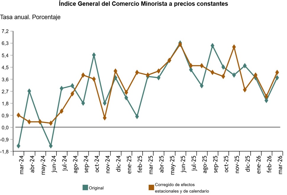 En términos de serie original, el ICM también mostró una evolución positiva, con un aumento interanual del 3,7%, lo que representa 1,7 puntos más que el mes anterior y confirma la tendencia de recuperación del consumo.