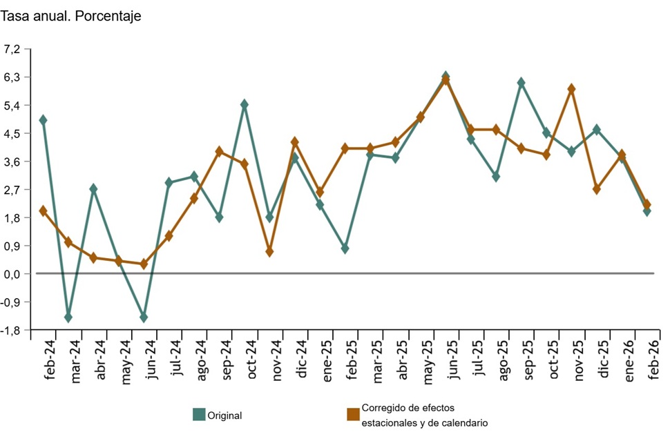 En la serie original, el incremento fue del 2,0%, también por debajo del dato del mes anterior, con una caída de 1,7 puntos.