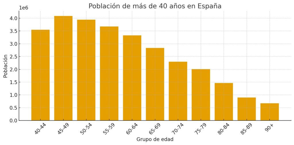 España, según los últimos datos del Padrón Continuo, alcanzó en octubre de 2025 la cifra histórica de 49.442.844 habitantes. De ellos, 28,7 millones superan los 40 años. La población más numerosa es la franja de 45 a 49 años, y a partir de ahí, el país se estrecha lentamente hacia las edades más avanzadas.