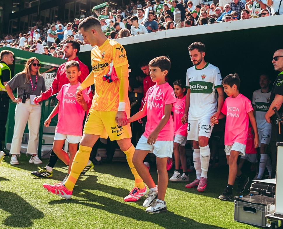 Durante el encuentro disputado frente al Athletic Club, los jugadores del Elche CF saltaron al césped acompañados por niños vestidos con una equipación oficial de Óptica Óptima, diseñada en el color corporativo de la marca